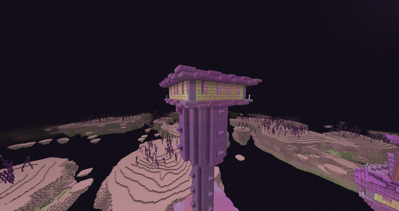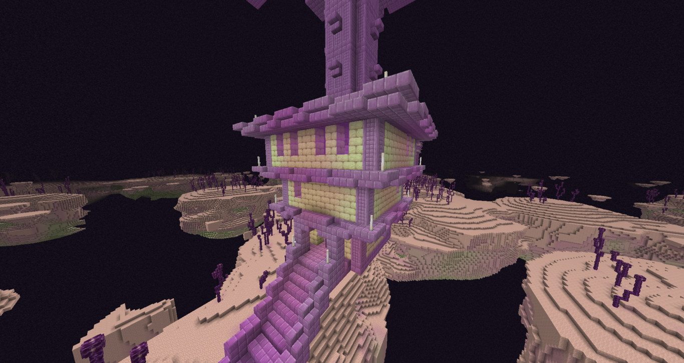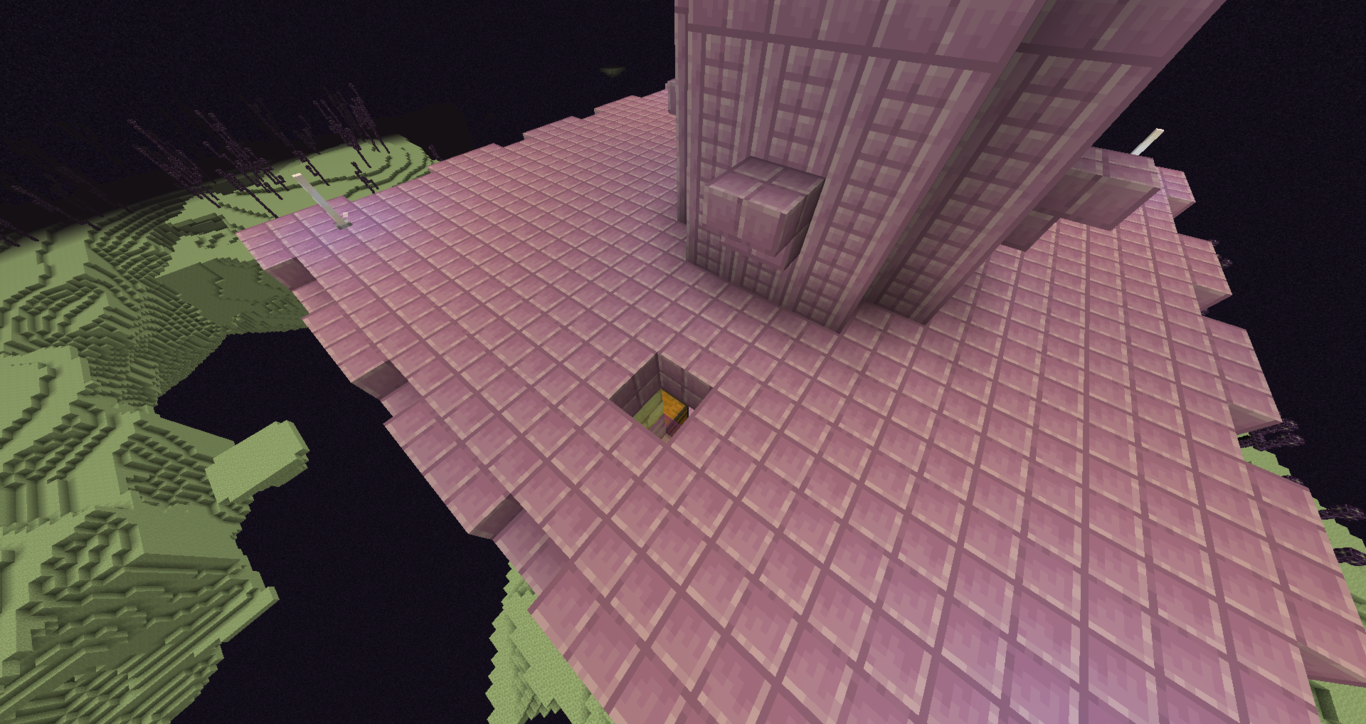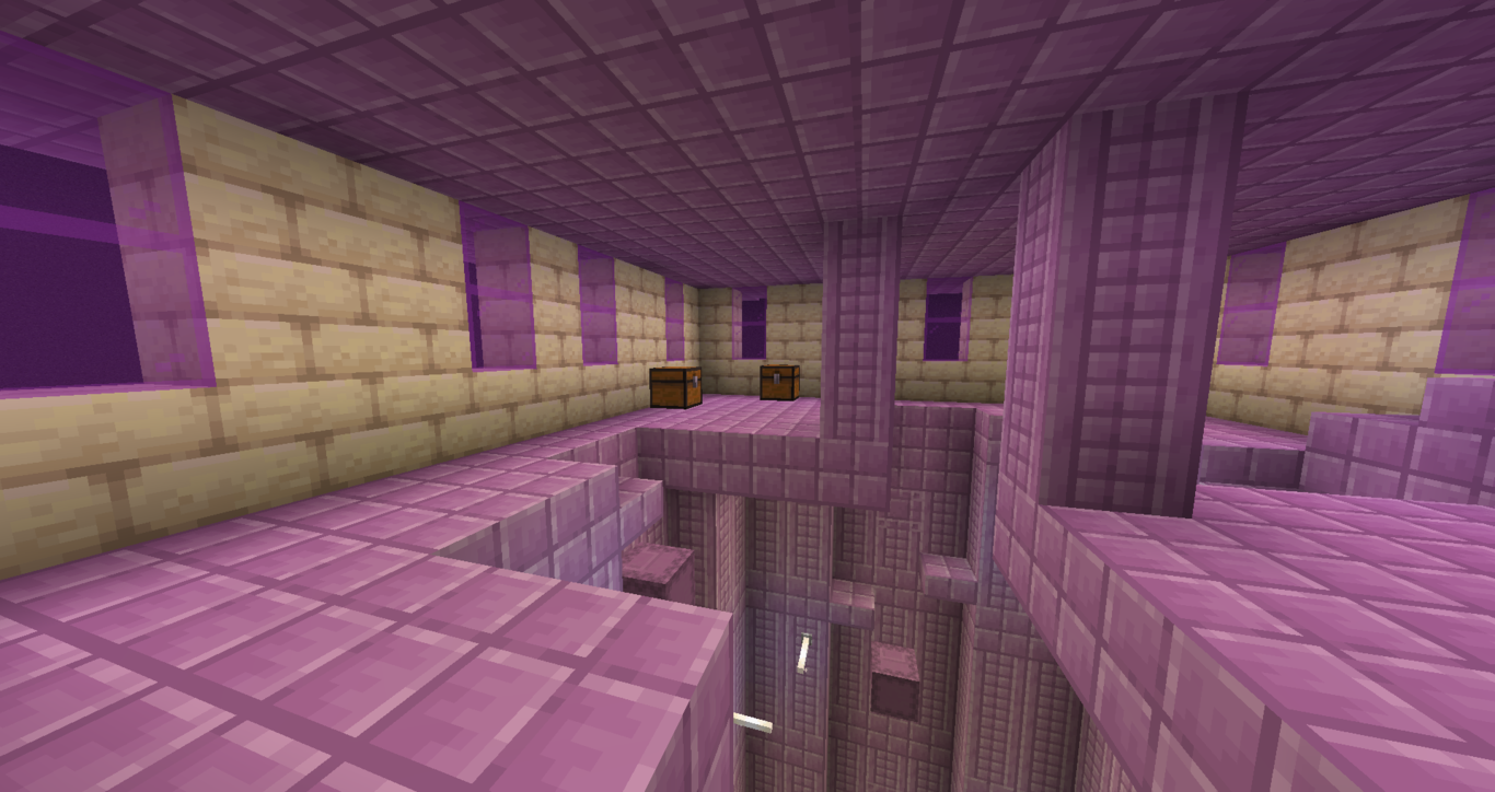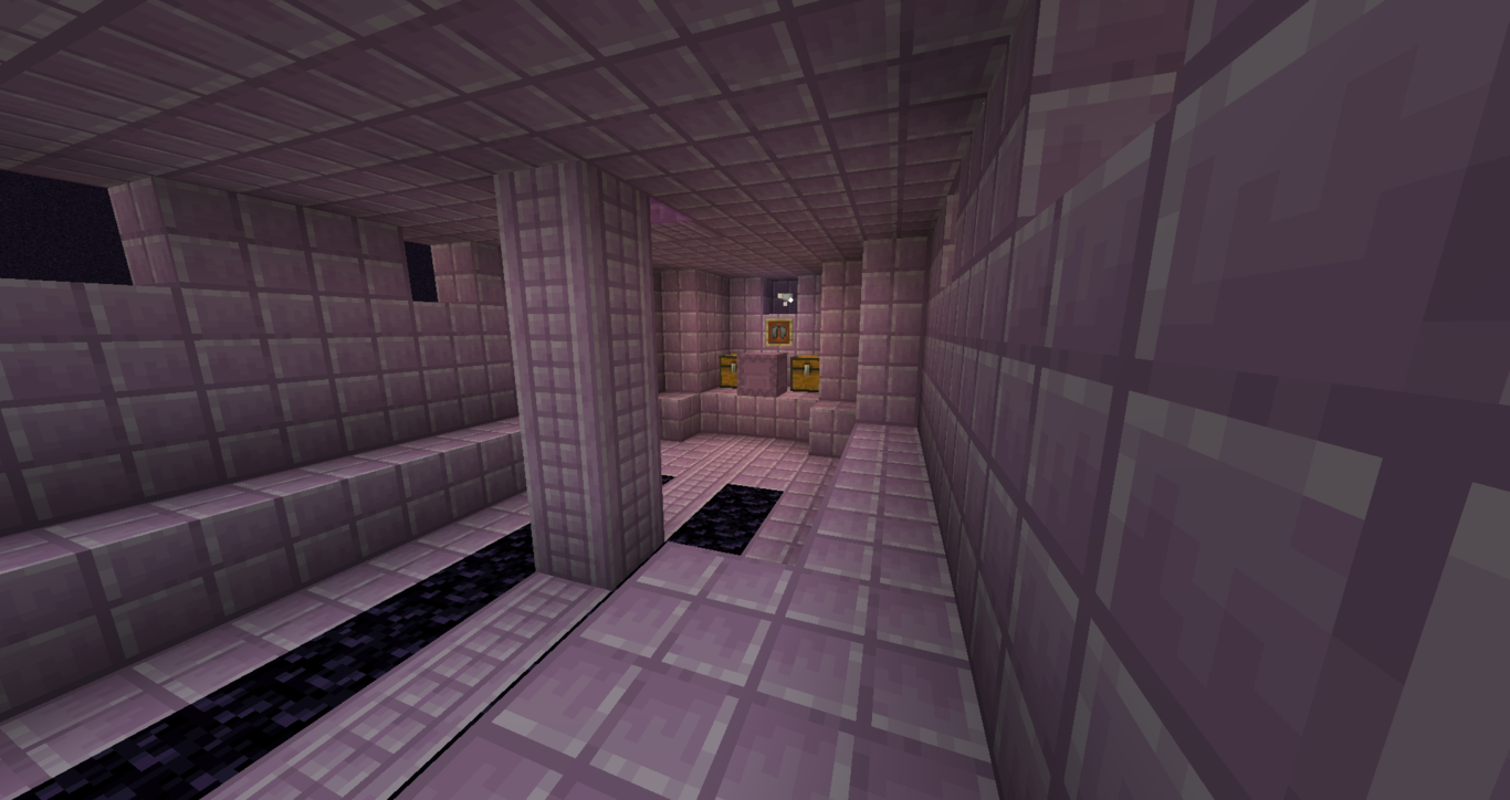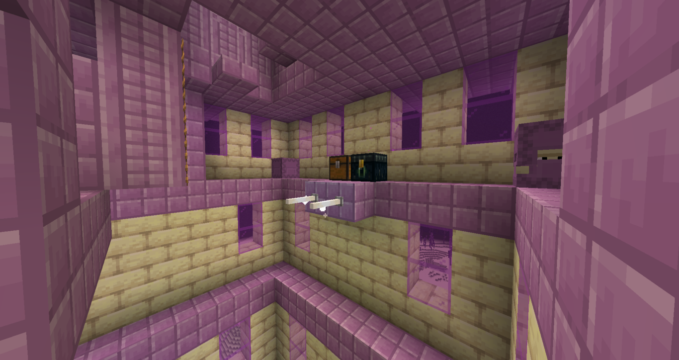 Третя й остання кімната — це скарбниця. Там завжди є одна скриня з лутом та одна скриня Енду. Кімната виглядає як перший поверх міста — відносно невелика триповерхова вежа. Шалкерів усередині достатньо, тож моя порада — піднятися водою нагору цієї вежі й зламати другий від краю блок по центру, щоб спуститися одразу до скрині (останній скрін нижче).